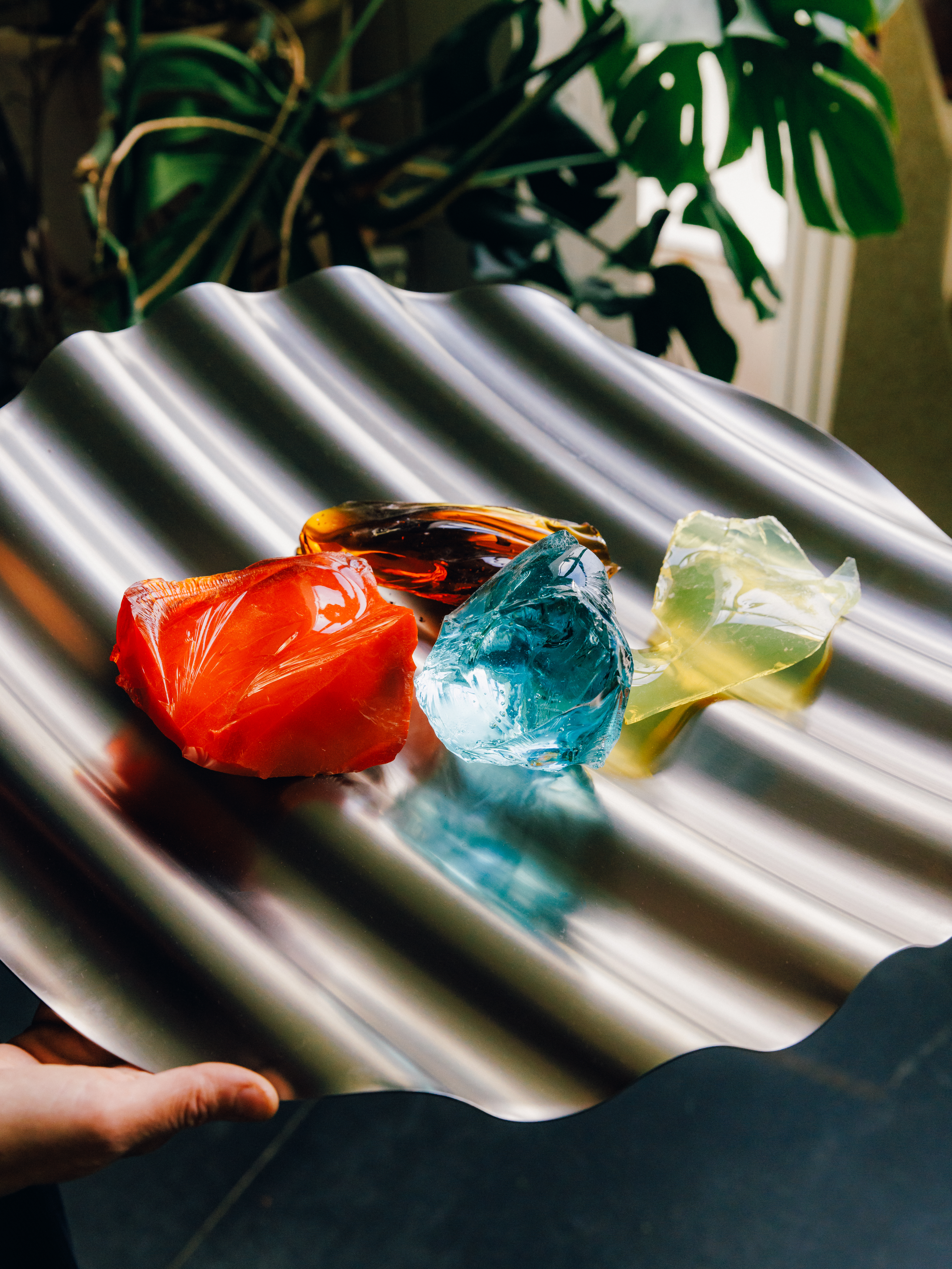 Working together in this way they have developed their own material composite, Basis Rho, with which they continue to push the boundaries of what is possible — composing artworks as well as functional objects flecked with vivid fragments of jewel-like glass. Their experiments happen both in the studio, and beyond it.