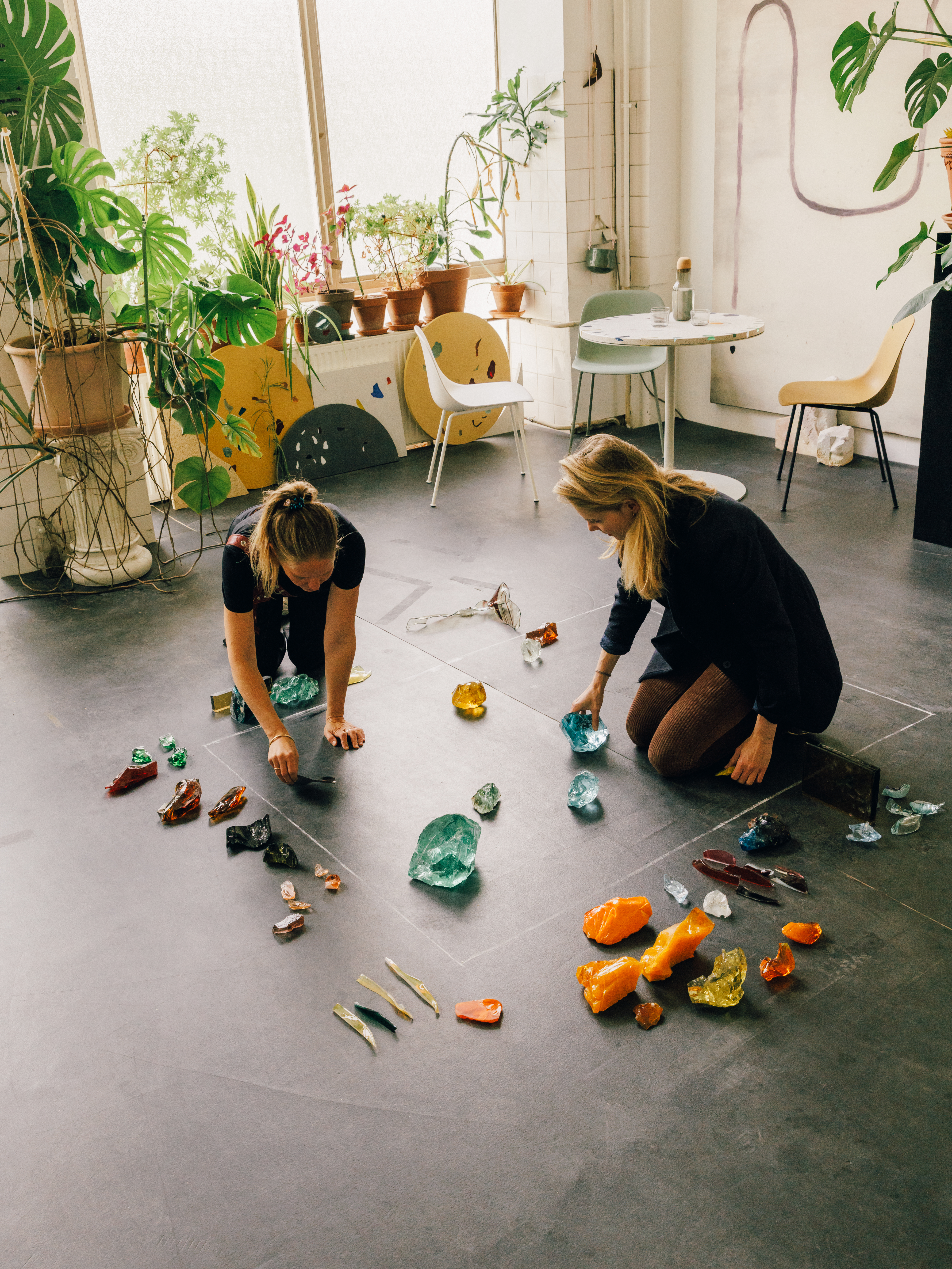 Jeschkelanger studio [The glass remnants] cannot be used anymore, for technical reasons, but they are as beautiful as gemstones. We give them another life, because we paint with them. They become our color palette.