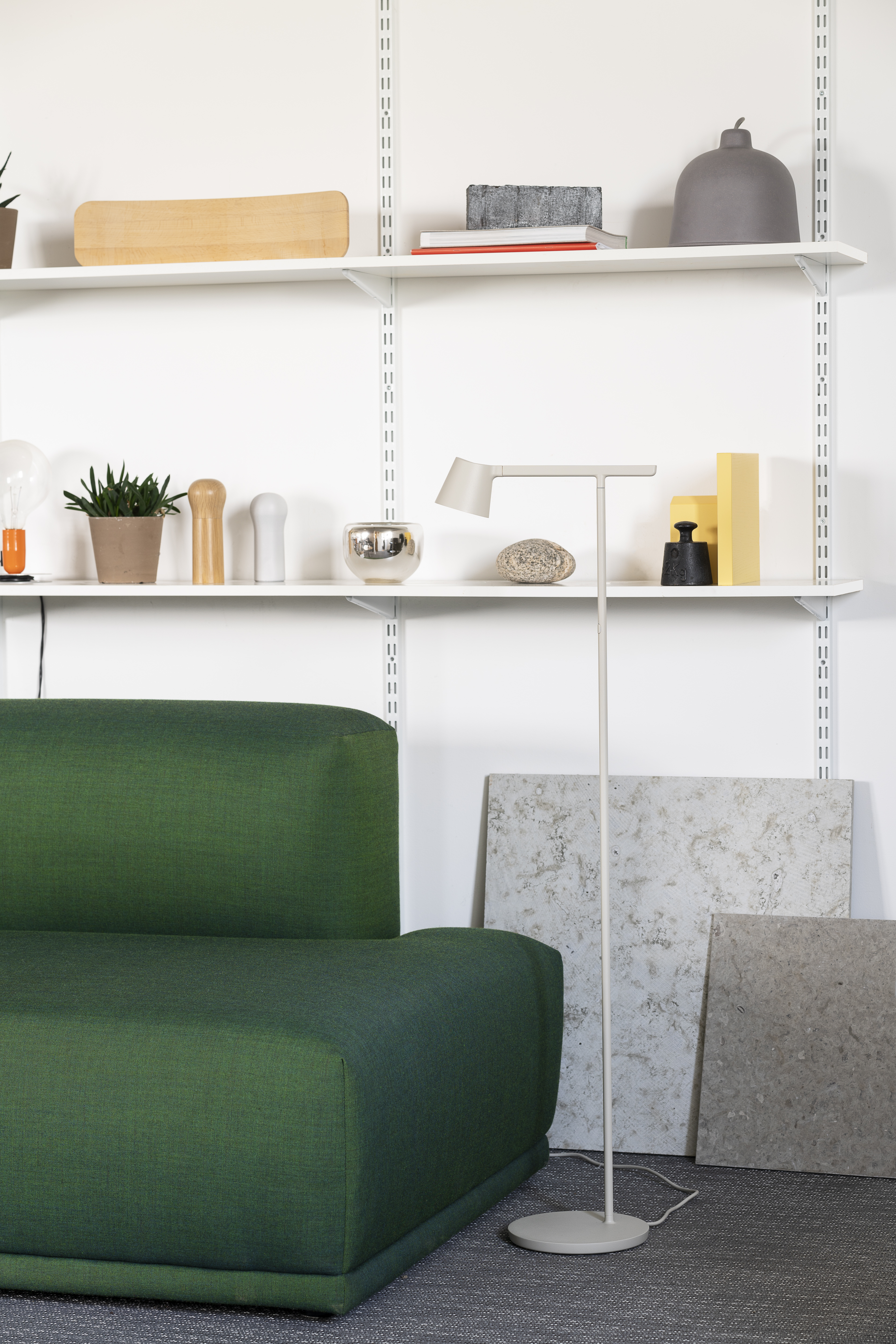 The Tip Wall Lamp is available in four different colors: Grey, Black, White and Copper Brown while the Tip Floor Lamp is available in Grey, Black and White.