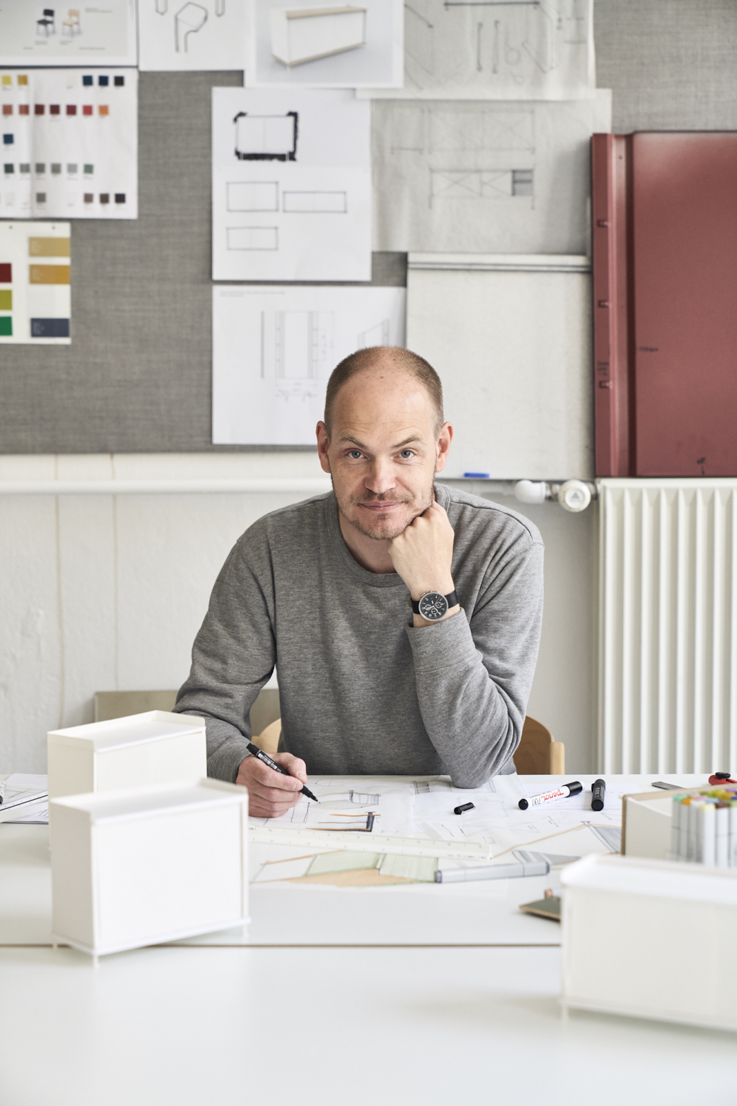 "The initial ideas for the Enfold Sideboard came from my own workshop. I have this table with a steel base in a powder lacquer with a solid oak table top and I wanted to translate this materiality into the sideboard. It was about having a wooden surface that was outlined by metal, creating space atop to place and store things, combined with the obvious function of a sideboard for ordinary storage with shelves that could be placed across three different levels. By combining the materials of wood and metal, the Enfold Sideboard brings industrial references into the home and workplace."