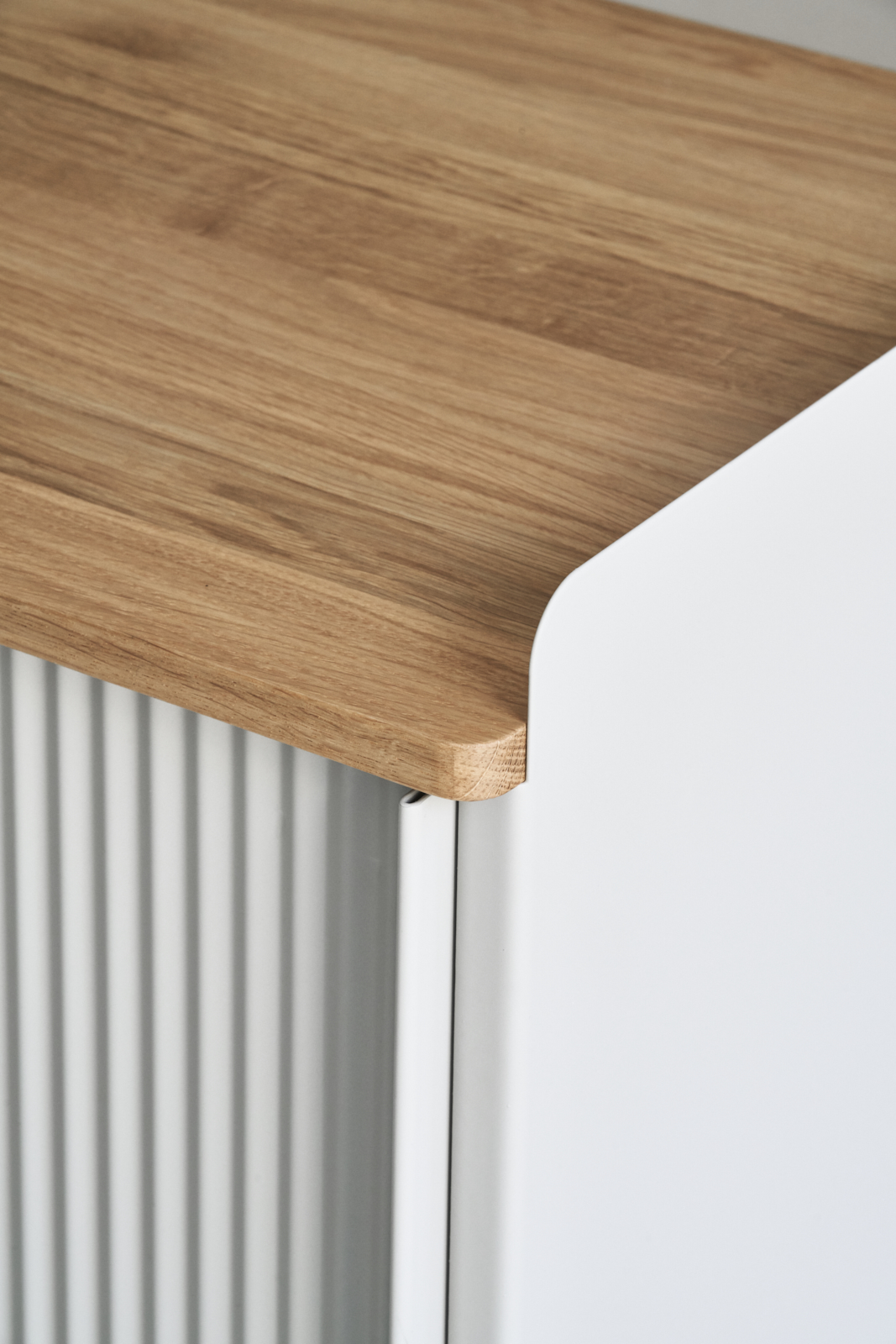 Combined with the metal is a solid, pure oak that with its warmth and friendliness might seem like an opposite to the cold metal. However, when placed together in the context of the sideboard, the two become complementing contrasts, bettering each other through their differences and shaping the expression of the Enfold Sideboard."
