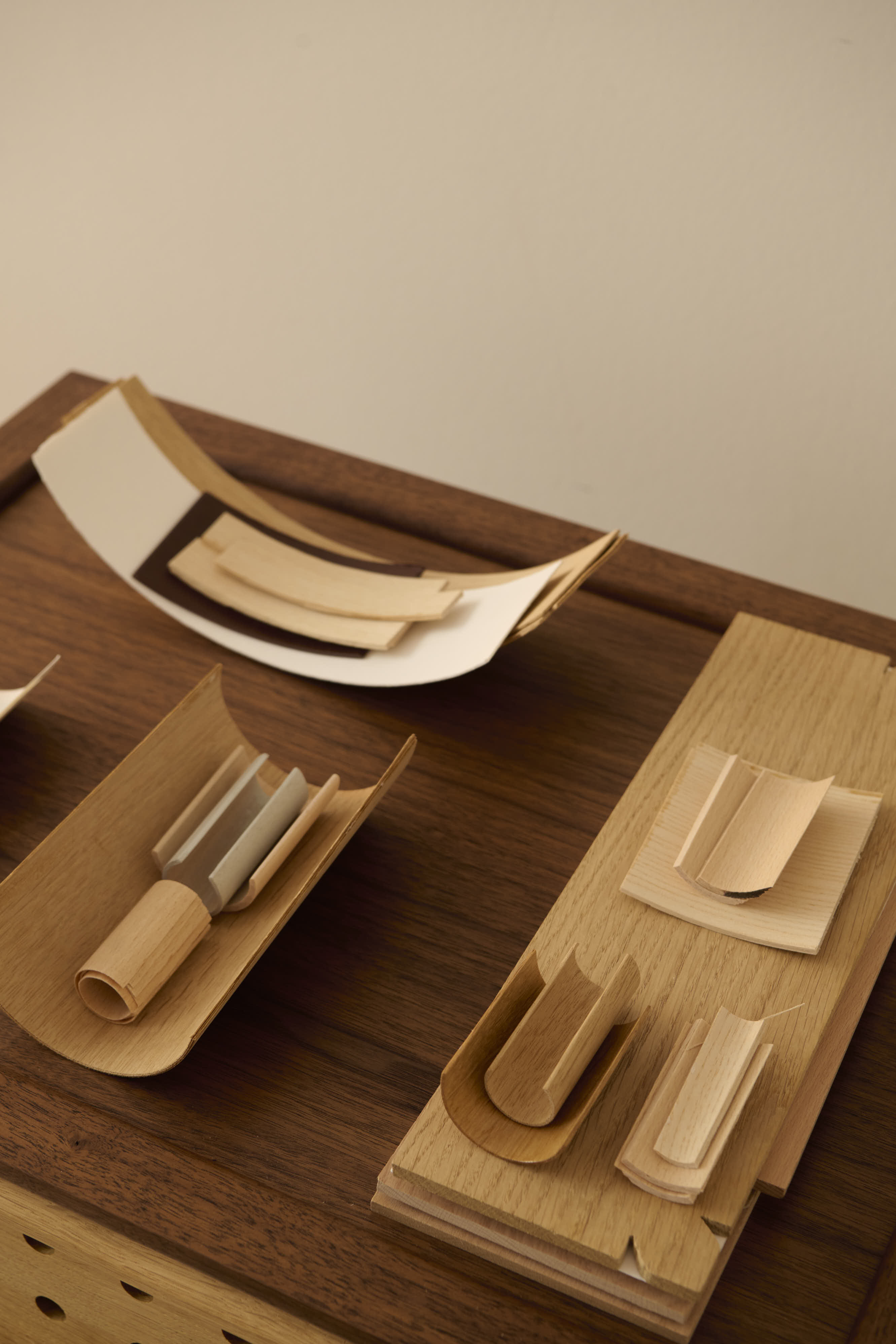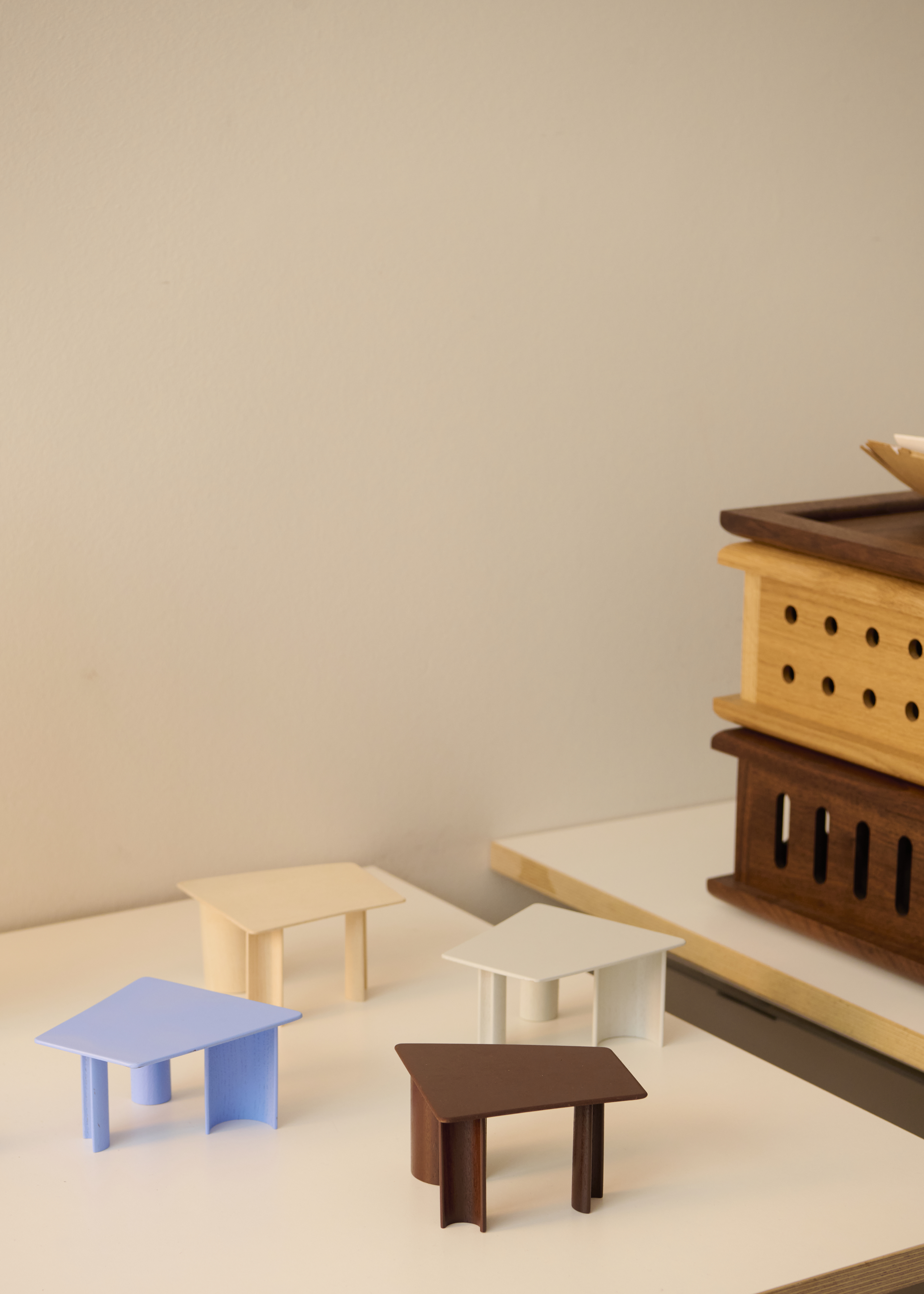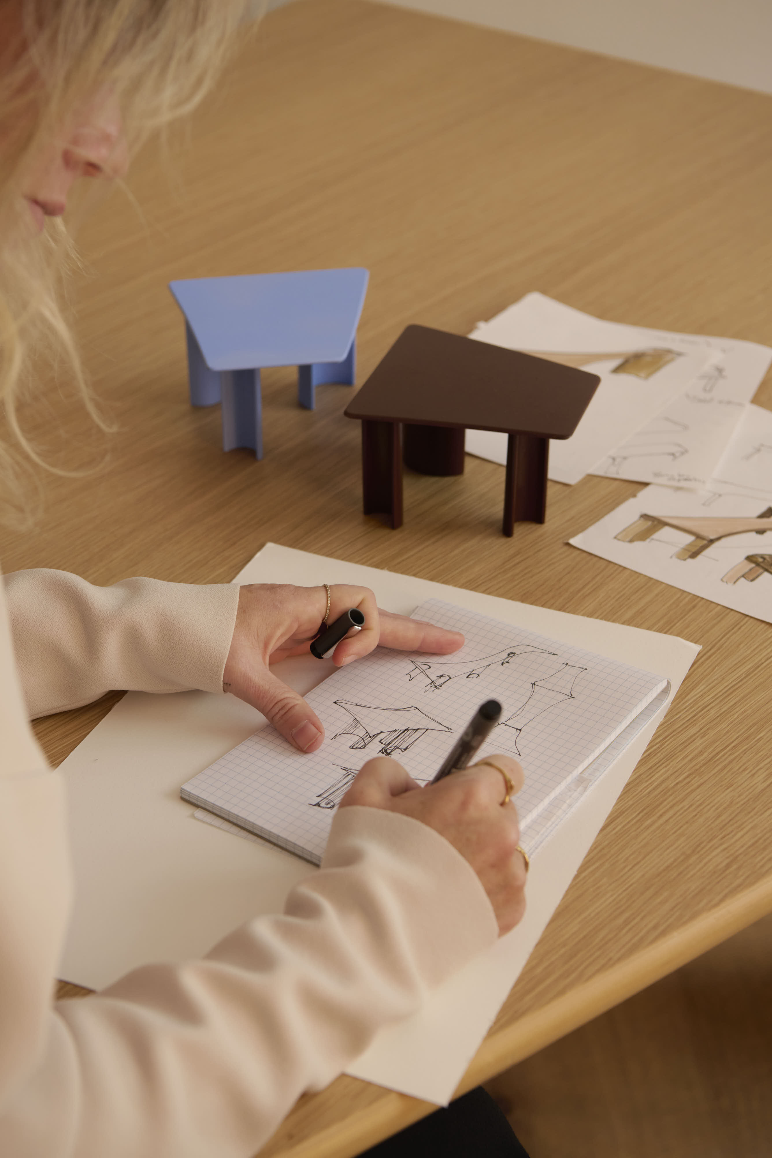 We visited Maria Bruun in her studio in Østerbro, Copenhagen, a bright, open space where large windows draw in daylight and illuminate prototypes, material samples, and working sketches. At the center stands Re-Norm in oak. Its sides are slightly uneven, and as you move around it, the geometry shifts. From above, the form resolves into a sail-like silhouette.