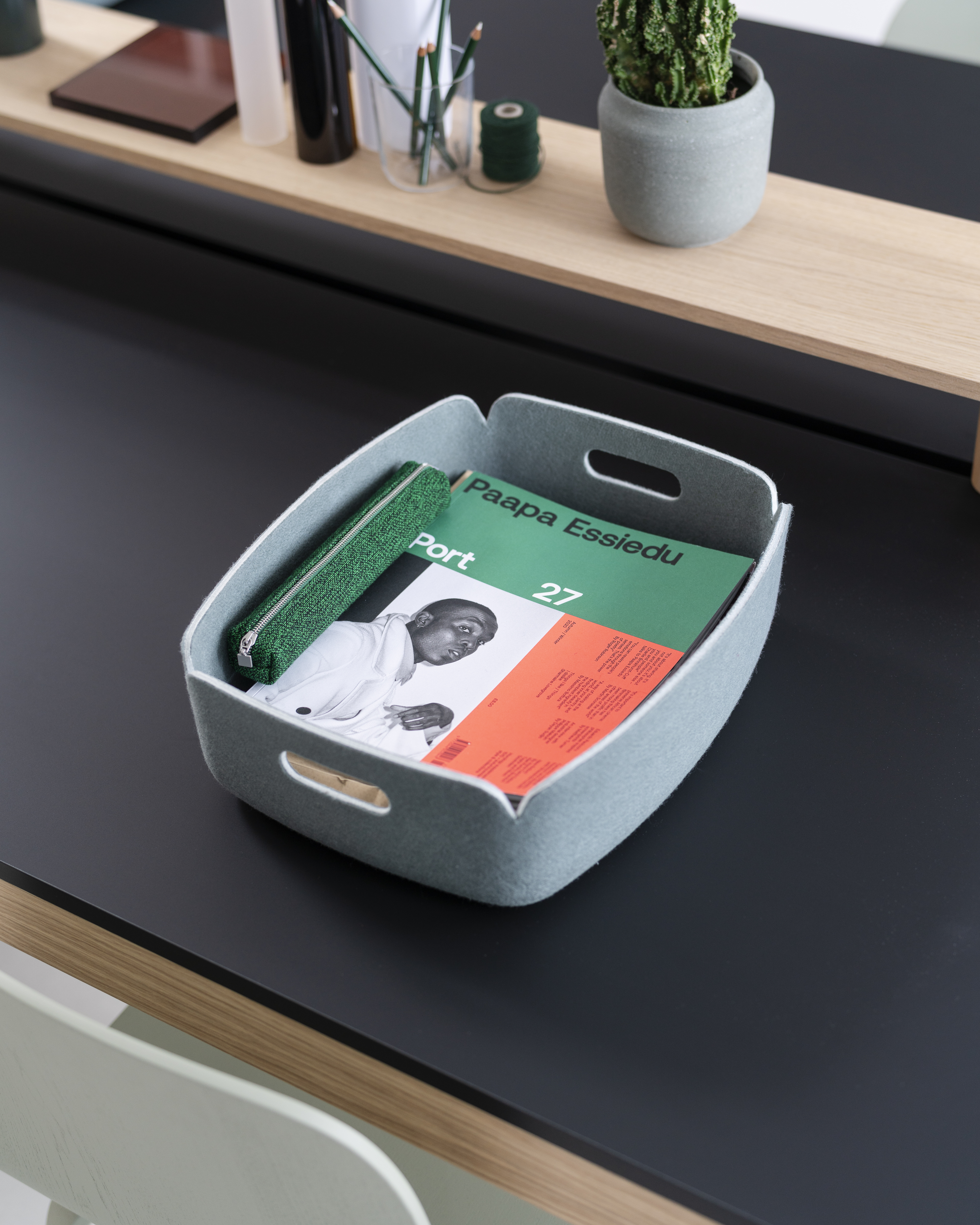 Staying on the topic of storage, our desk space can often become a mess with pens, tape rolls, paperclips and scissors flowing all over alongside documents, sketches and note pads. Use the Restore Tray, made using fibers from recycled plastic bottles for a new perspective on home office storage.