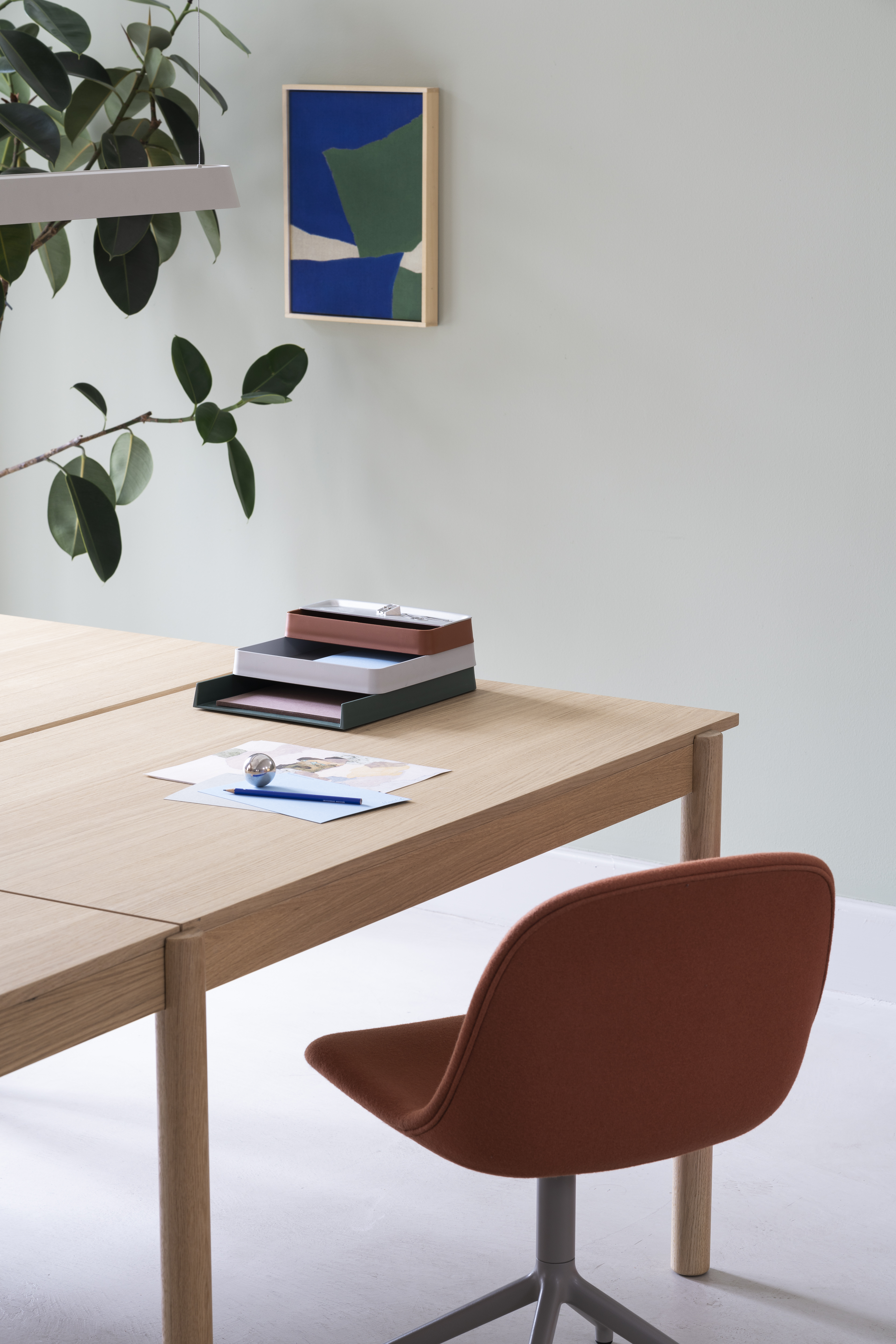If you have a room that can be used for a home office, then great, but if not, do not fear; Create a desk setting that can also be placed in the corner or up against a wall in other rooms. Seen here is the enveloping comfort of the Fiber Armchair, designed with a height-adjustable swivel base with castors that allows for you to move freely around the room and adjust the chair to your exact needs. Joining the chair is the Workshop Table with a linoleum tabletop for a durably elegant perspective on a home office desk.