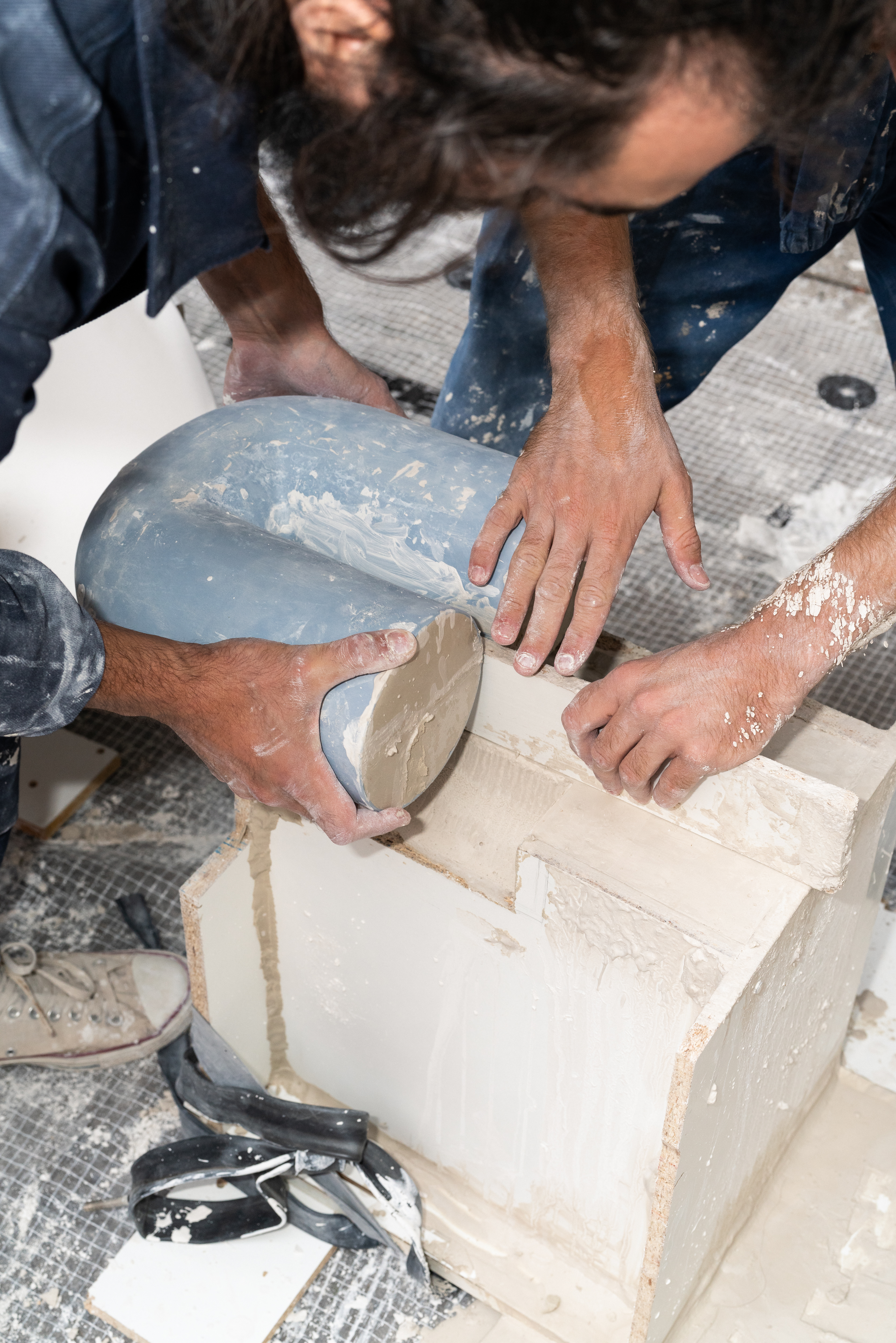 We met the duo outside of Ronco’s Copenhagen studio where they’re hard at work, working at sculpting the pieces for the Ukurant Perspectives 2021 exhibition. It’s a sunny day in the end of summer, meaning a perfect opportunity for working outside. They seem like they know what they’re doing as well, Ronco and Dorigo. After all, they’ve worked together for quite some time.