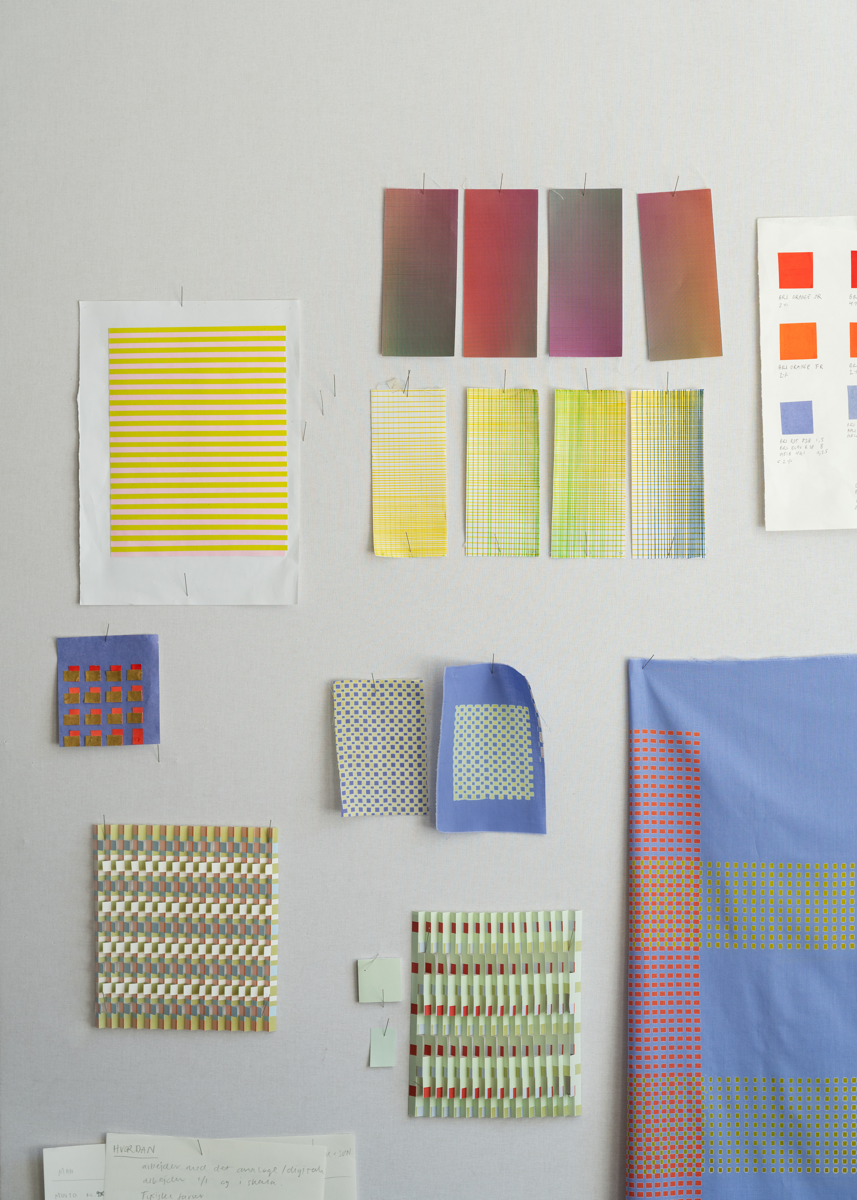 We investigate how the interplay of color, patterns and scale affects our perception. Our eternal starting point is to uncover how we as individuals experience colors and patterns, exploring how these elements influence the bodily experience. On a more pragmatic level, we seek to challenge the traditional printing technique of screen printing by contrasting it with digitally developed patterns. For this year’s Ukurant exhibition, we’ll be showing a series of screen-printed textiles that have been developed using both reactive dye and color discharge, leaving the two textiles with two different expressions and color identities.