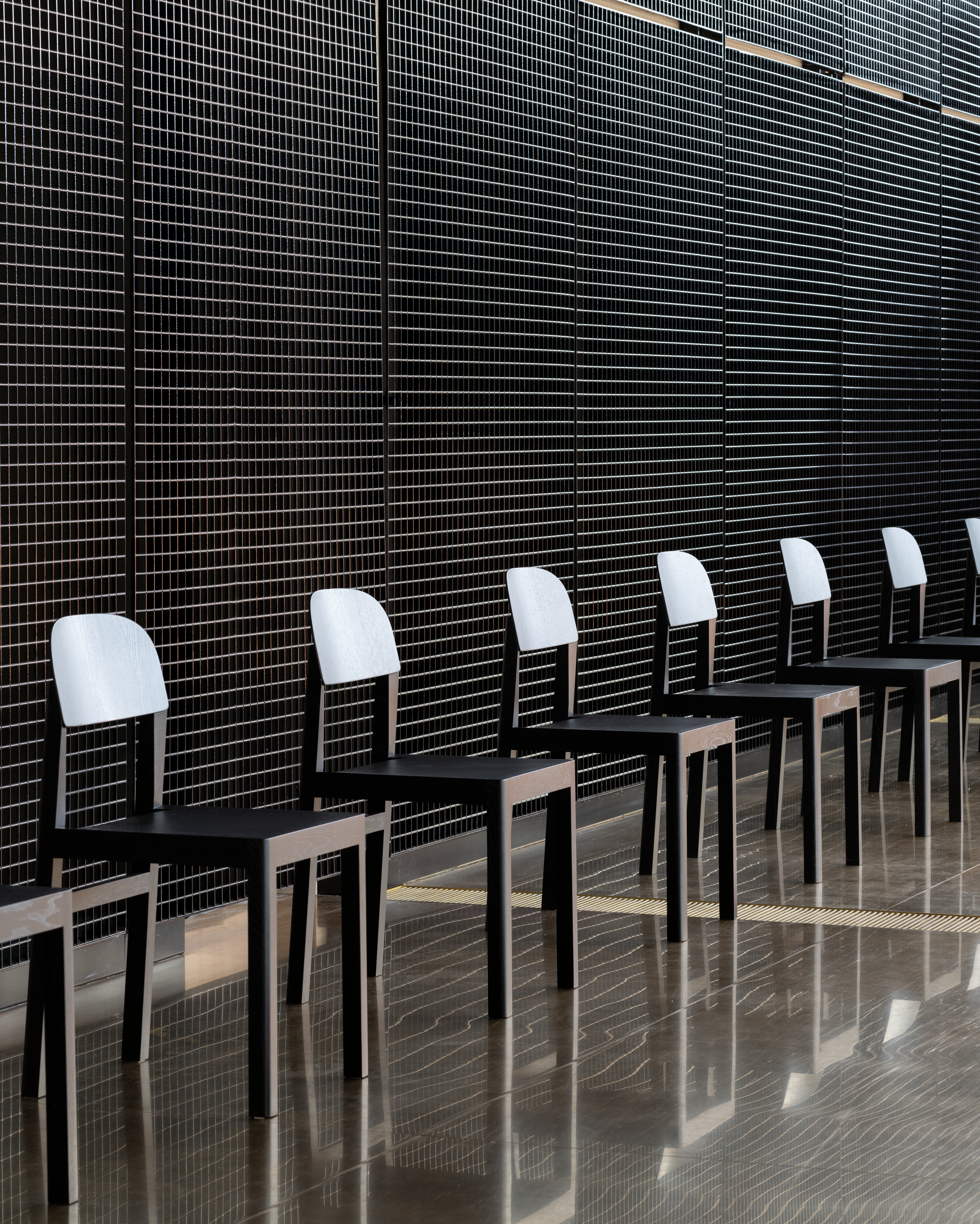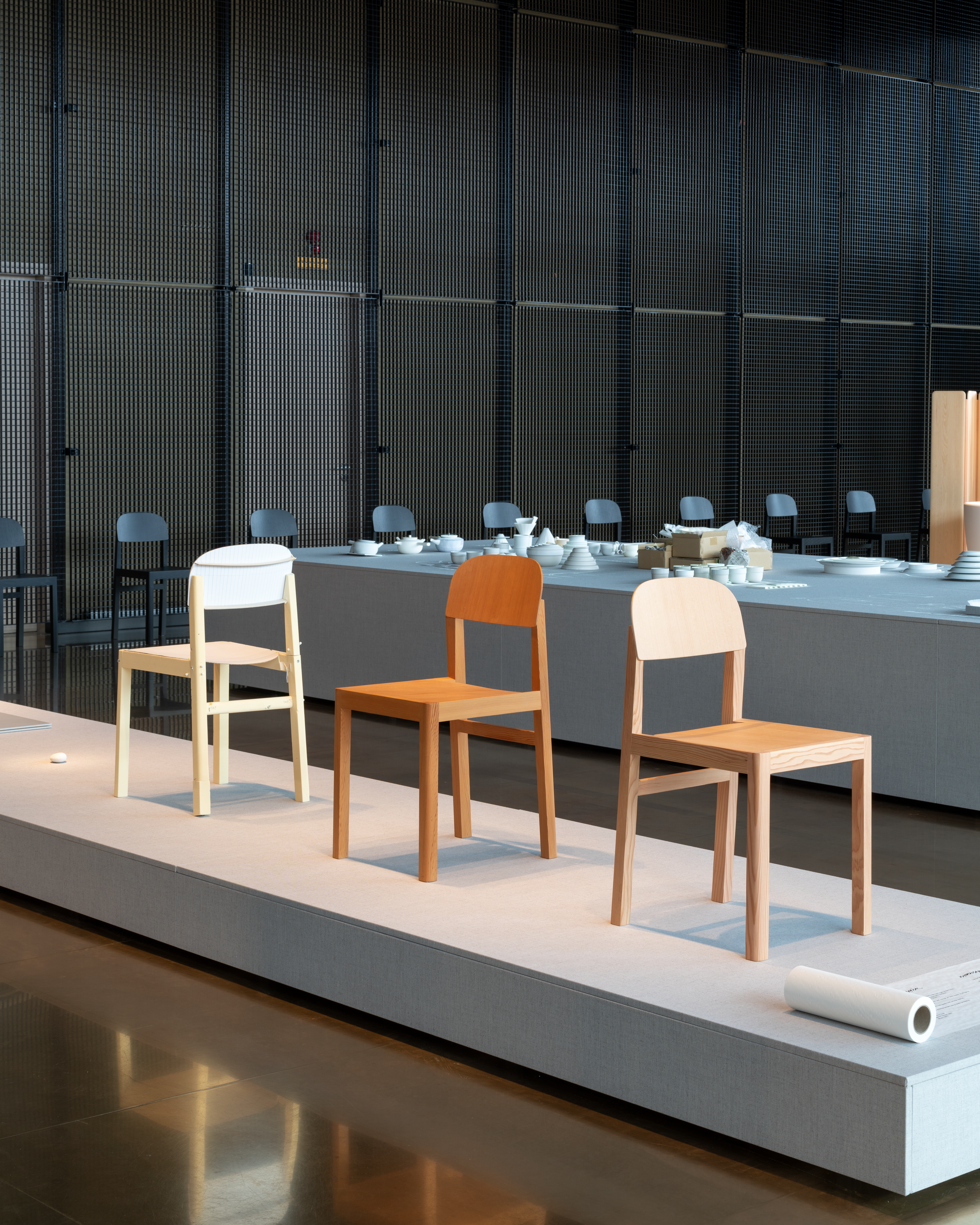 Upon entering the exhibition at the Danish Architecture Center, one meets the first podium upon which the design process of the Workshop Chair is brought to life while a number of the chairs in black are lined up against each wall.