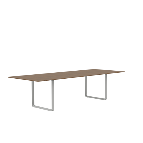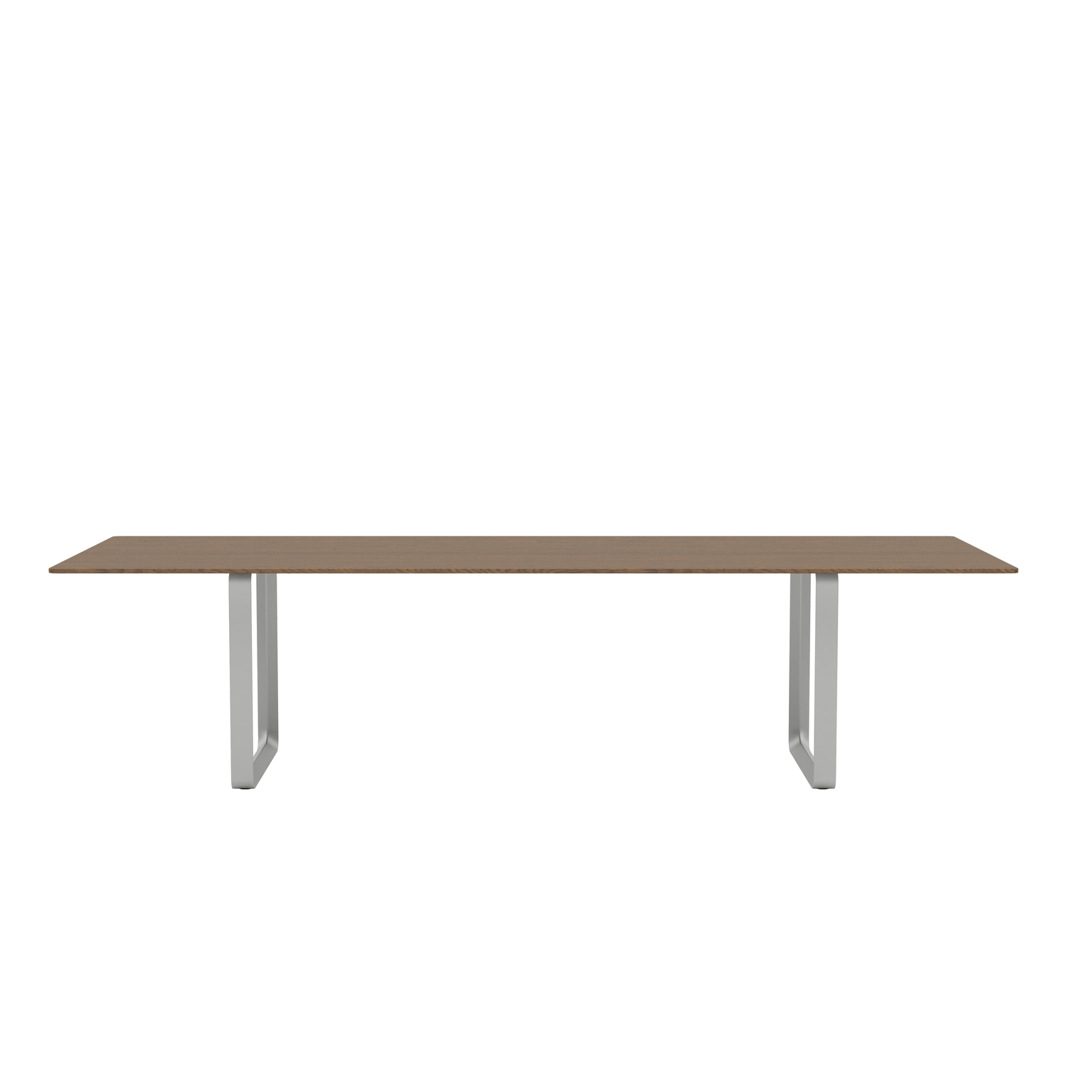 Tabletop in plywood with lacquered oak veneer surface, Black and Grey version in plywood with linoleum surface, White version in plywood with laminate surface (HPL). Solid Oak and Solid Smoked Oak tabletop in FSC™-certified (FSC-C028824) oak. Frame in powder-coated aluminum.