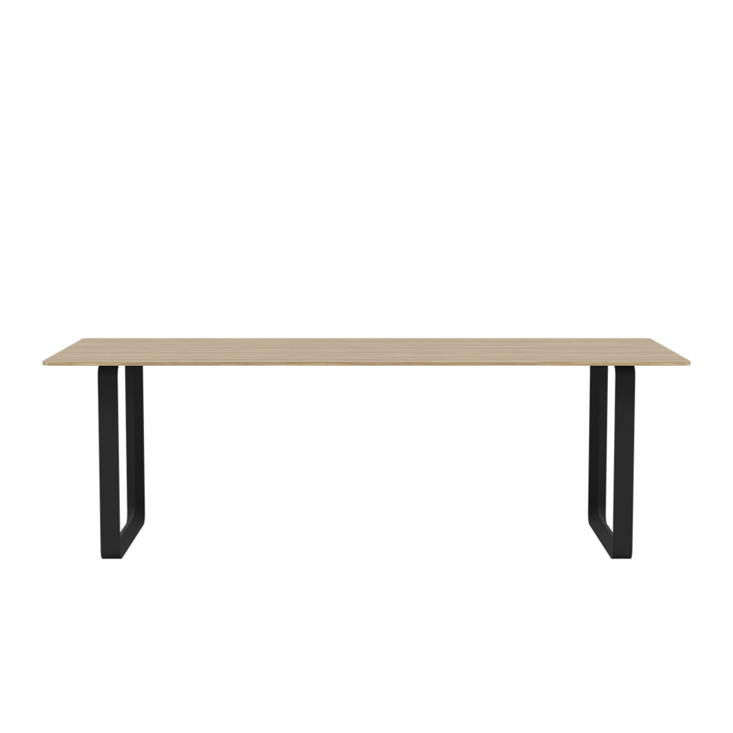 Tabletop in plywood with lacquered oak veneer surface, Black and Grey version in plywood with linoleum surface, White version in plywood with laminate surface (HPL). Solid Oak and Solid Smoked Oak tabletop in FSC™-certified (FSC-C028824) oak. Frame in powder-coated aluminum.
