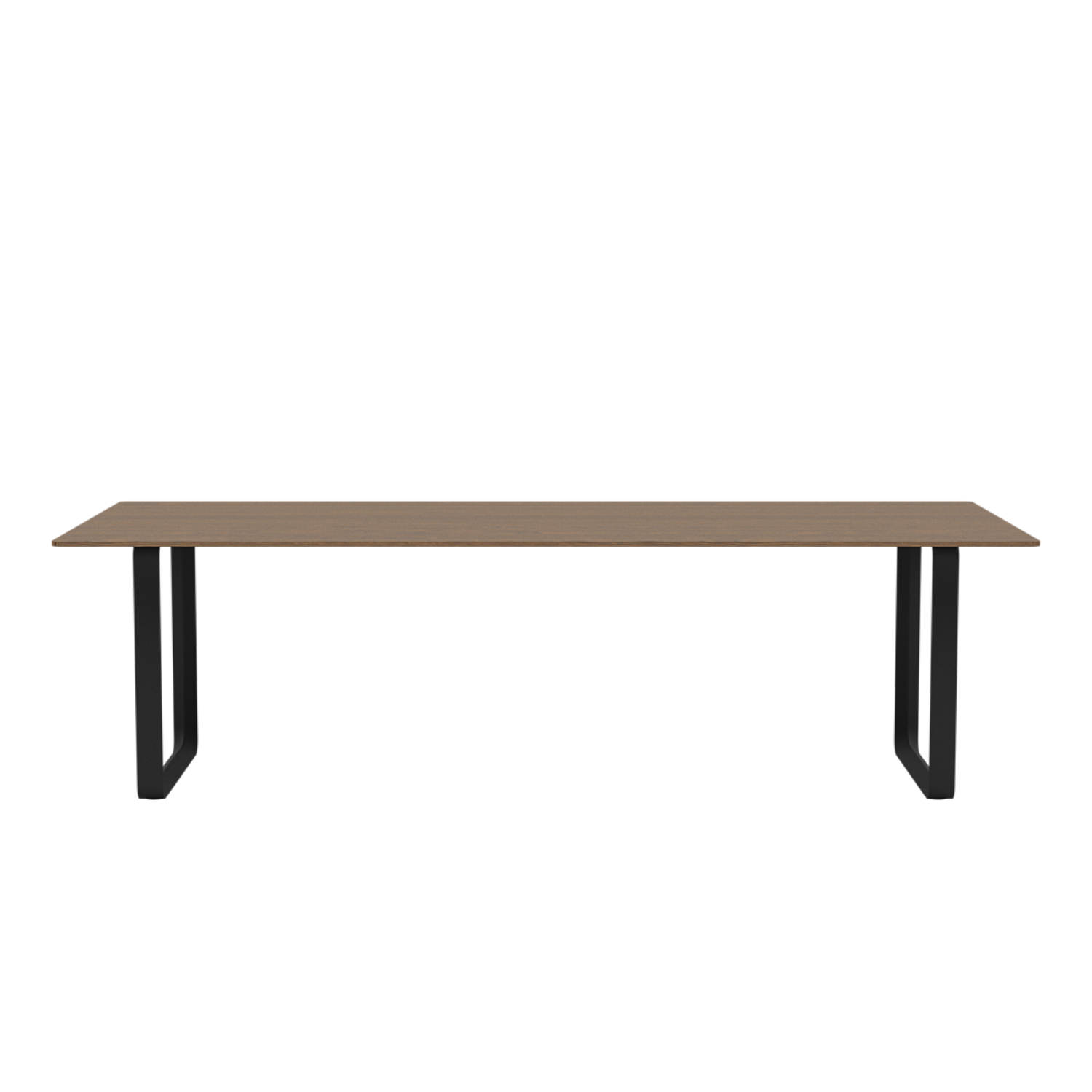 Tabletop in plywood with lacquered oak veneer surface, Black and Grey version in plywood with linoleum surface, White version in plywood with laminate surface (HPL). Solid Oak and Solid Smoked Oak tabletop in FSC™-certified (FSC-C028824) oak. Frame in powder-coated aluminum.