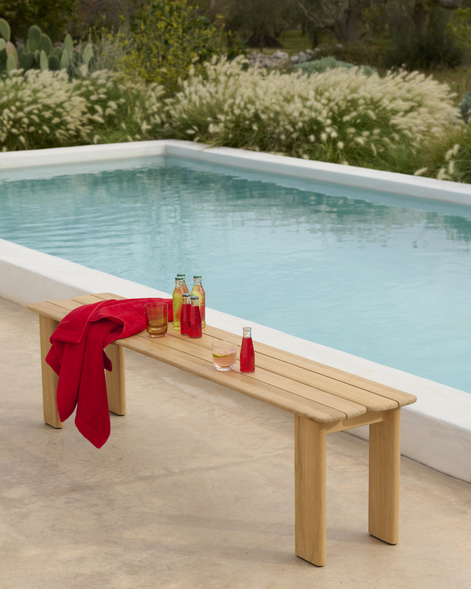 Made using FSC™-certified (FSC-C028824) teak. Teak is a durable hardwood well-suited for outdoor use. As a natural material, teak will display variations in color and grain from one piece to another. When left untreated, the wood will gradually develop a silver-grey patina. Over time, outdoor exposure may also lead to small cracks at the ends of the planks and slight warping, which can result in minor height differences between them. Direct sunlight may cause temporary color variations if objects are left on the surface for extended periods; these will even out once the object is removed. To maintain a deeper, warmer tone, clear tabletop oil can be applied periodically. The bench is fitted with plastic glides suitable for outdoor use.