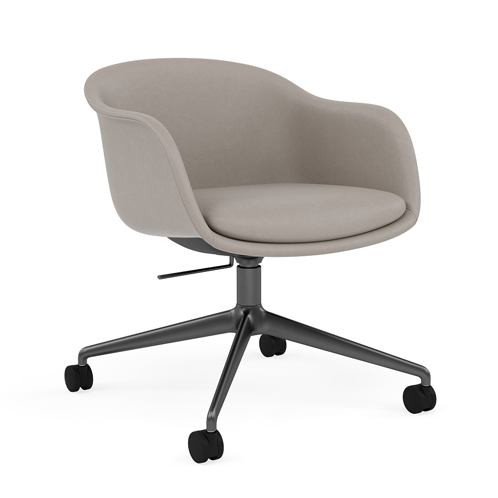 Swivel base in powder coated aluminum made using minimum 95% recycled die casted aluminum. The recycled die casted aluminum comes from a mix between post-industrial and post-consumer waste. Cylinder in steel. Castors.
