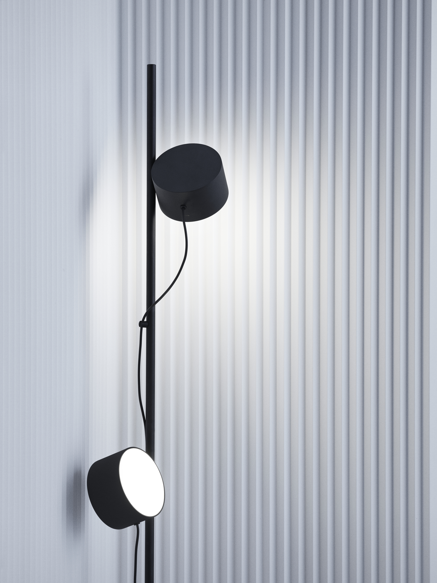 The Post Floor Lamp is an innovative modular lighting design with an archetypal appearance, graphic lines and forward-thinking functionalities. Exploring the utmost flexibility of a magnetic joint, the individual lighting units of the design can be positioned, turned and dimmed up and down to individual needs. Use the magnetic cable drops to position the cords on the rod. The Post Floor Lamp comes with two lighting units. An additional lighting unit can be purchased as spare part and added to the design by plugging it into the power hub and positioning it on the rod.