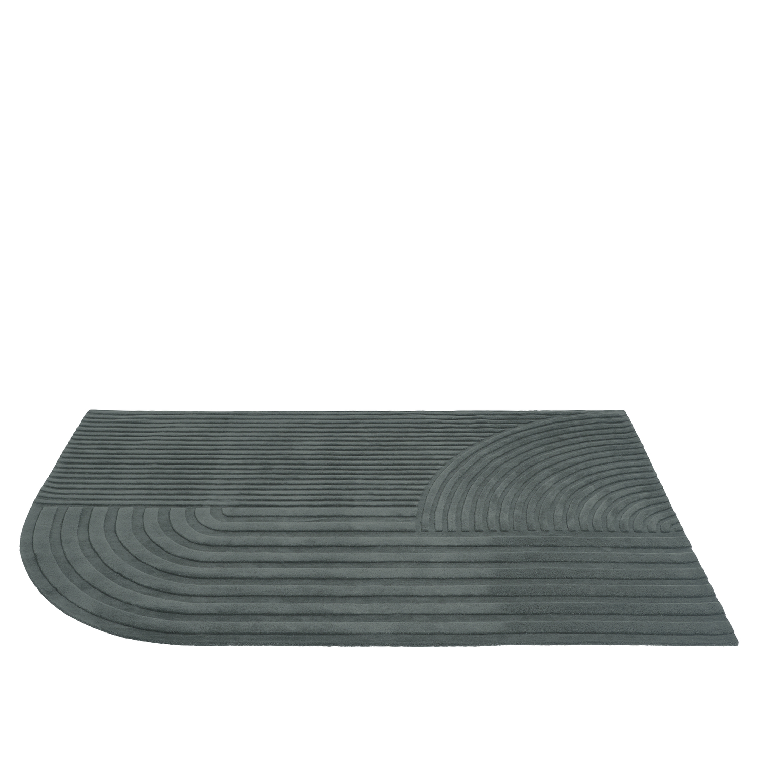 Relevo is a soft rug with a distinctly sculptural quality. Its striking graphic pattern is produced by trimming the tufted wool in different levels, thereby creating an eye-catching shadowplay that gives a sense of being two-tone rather than monochrome. The rug’s single rounded corner gives it a unique character, a dynamic expression in any setting.
