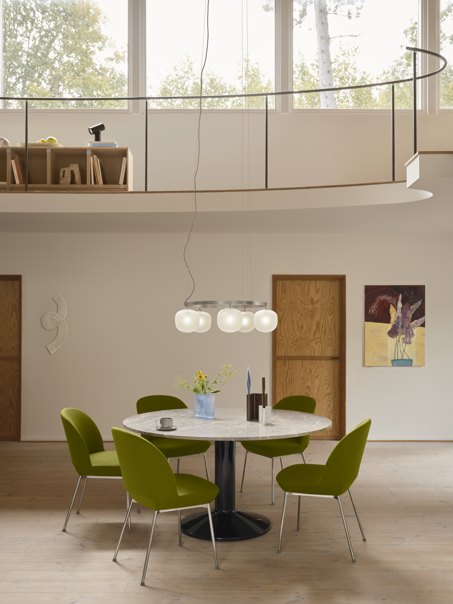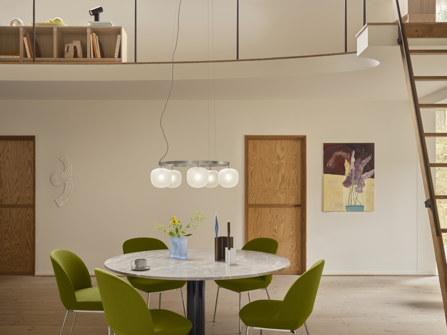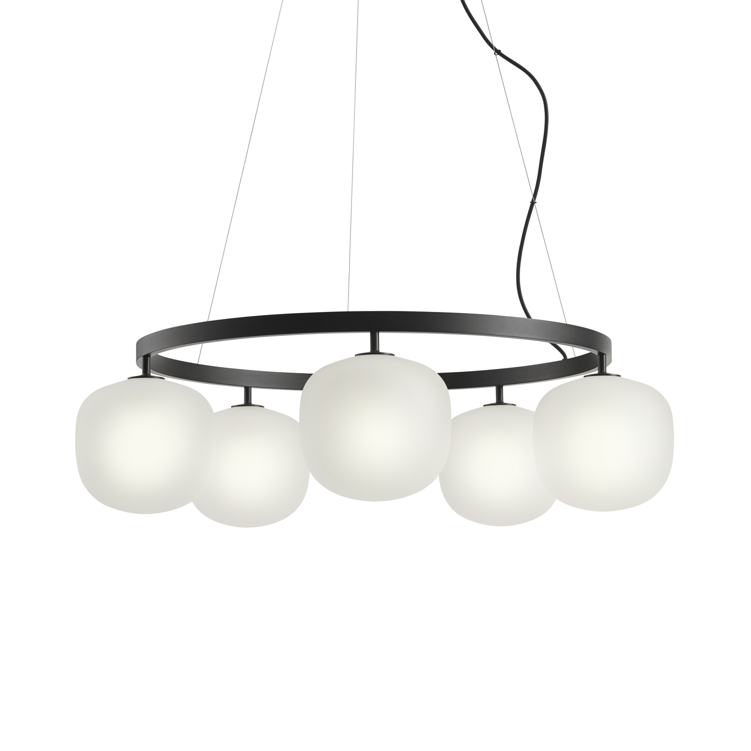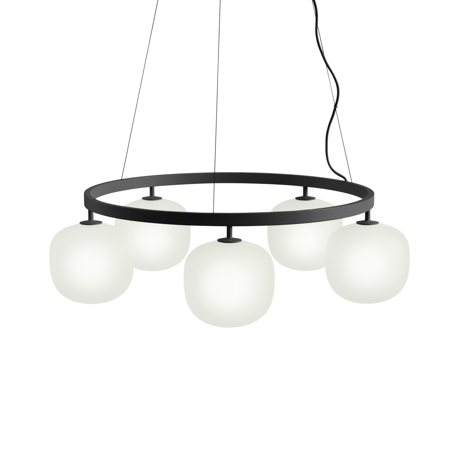 Rime Chandelier reimagines the classic glass pendant as a striking light sculpture. Featuring five mouth-blown, sandblasted glass shades, it casts a soft, refined glow while its square-profile aluminum suspension adds sharp, architectural contrast. Designed for high ceilings, it makes a bold statement above round tables and dining areas. Visible screws and industrial finishes—White, Black, or Aluminium Grey—highlight its modern character. Each shade includes a high-quality G9 bulb with a color rendering index above 90 for warm, consistent illumination. Glass shades, suspension, and cables can all be replaced for lasting durability.