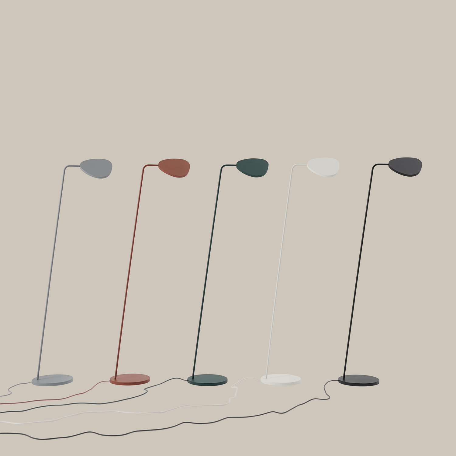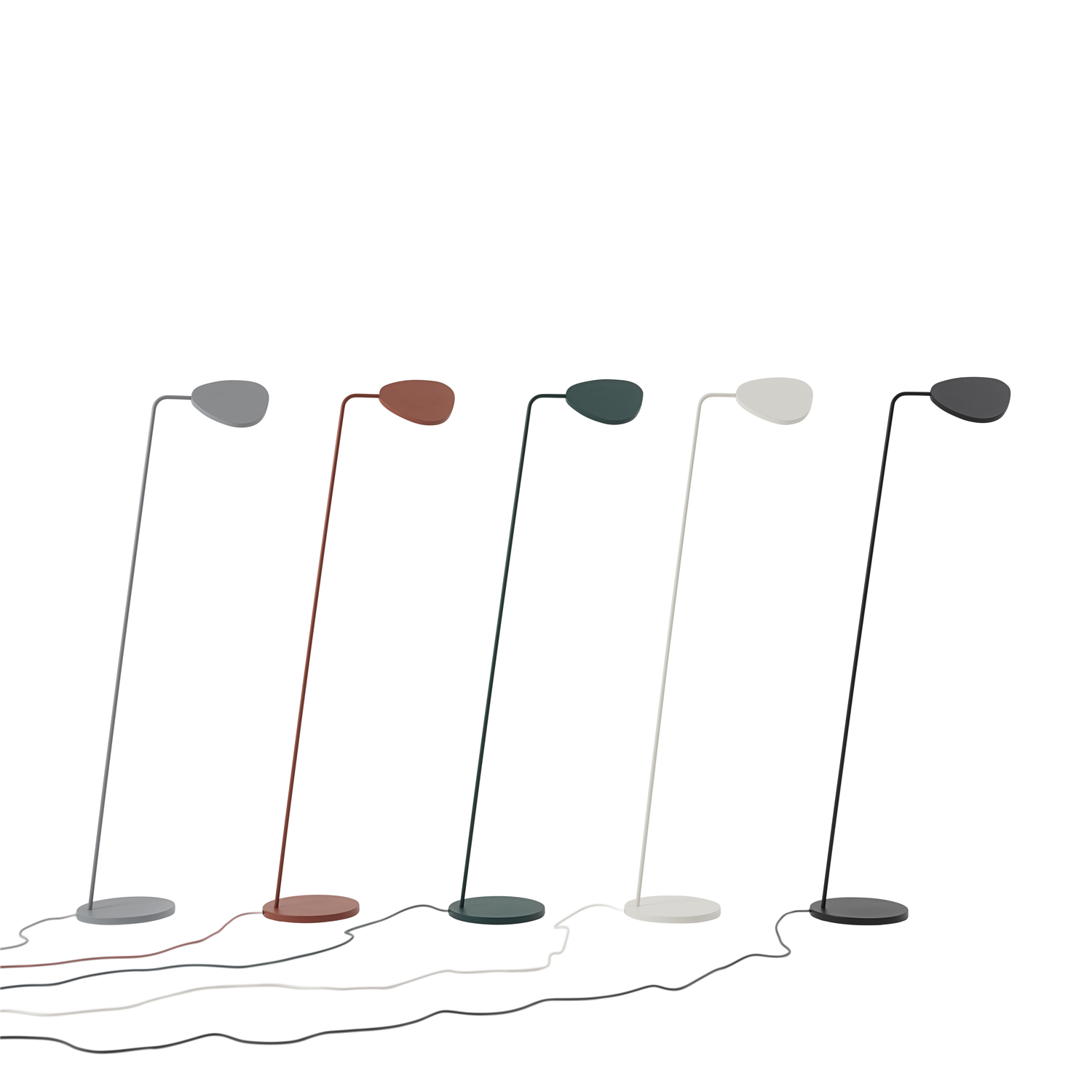 Aluminum, Brass, Coloured PVC cord. The Leaf Floor Lamp is a result of a process combining turned and casted aluminum and steel, with a strong powder coating as paint. It has a build-in energy-efficient LED bulb with a Lumen Maintenance (Lifetime) of L70 B10 54.000hrs