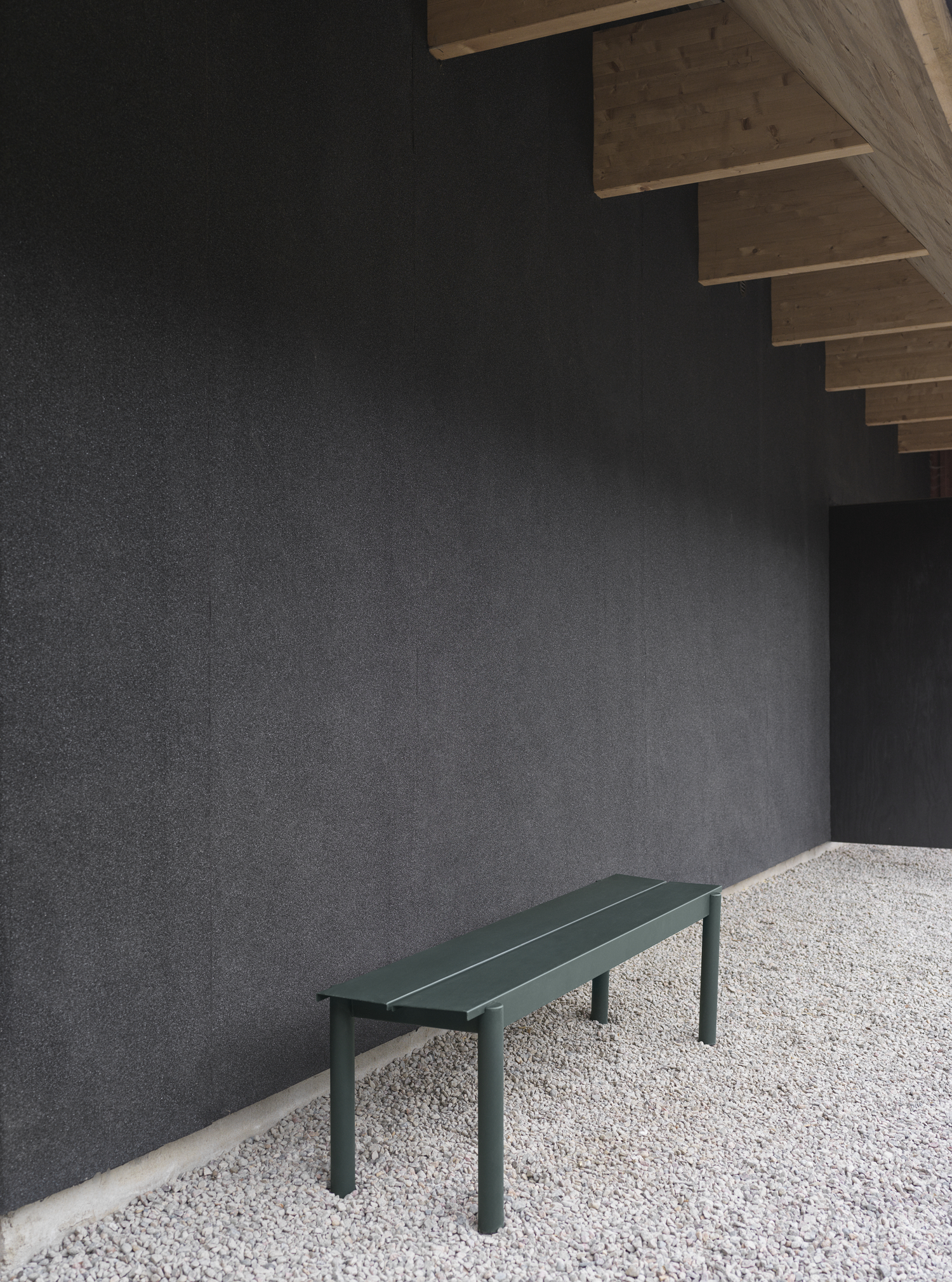 The Linear Steel Bench brings new perspectives to modern outdoor furniture through its straight lines alongside the folded edges, halfcircular intersecting legs and small spacing for easy removal of water. Kept visually clean for long-lasting aesthetics, the Linear Steel Bench finds its distinct character through subtle detailing and a simple expression, allowing for it to complement any outdoor setting. The Linear Steel Bench is designed in proportions that allow for it to slide easily under the matching Linear Steel Table.