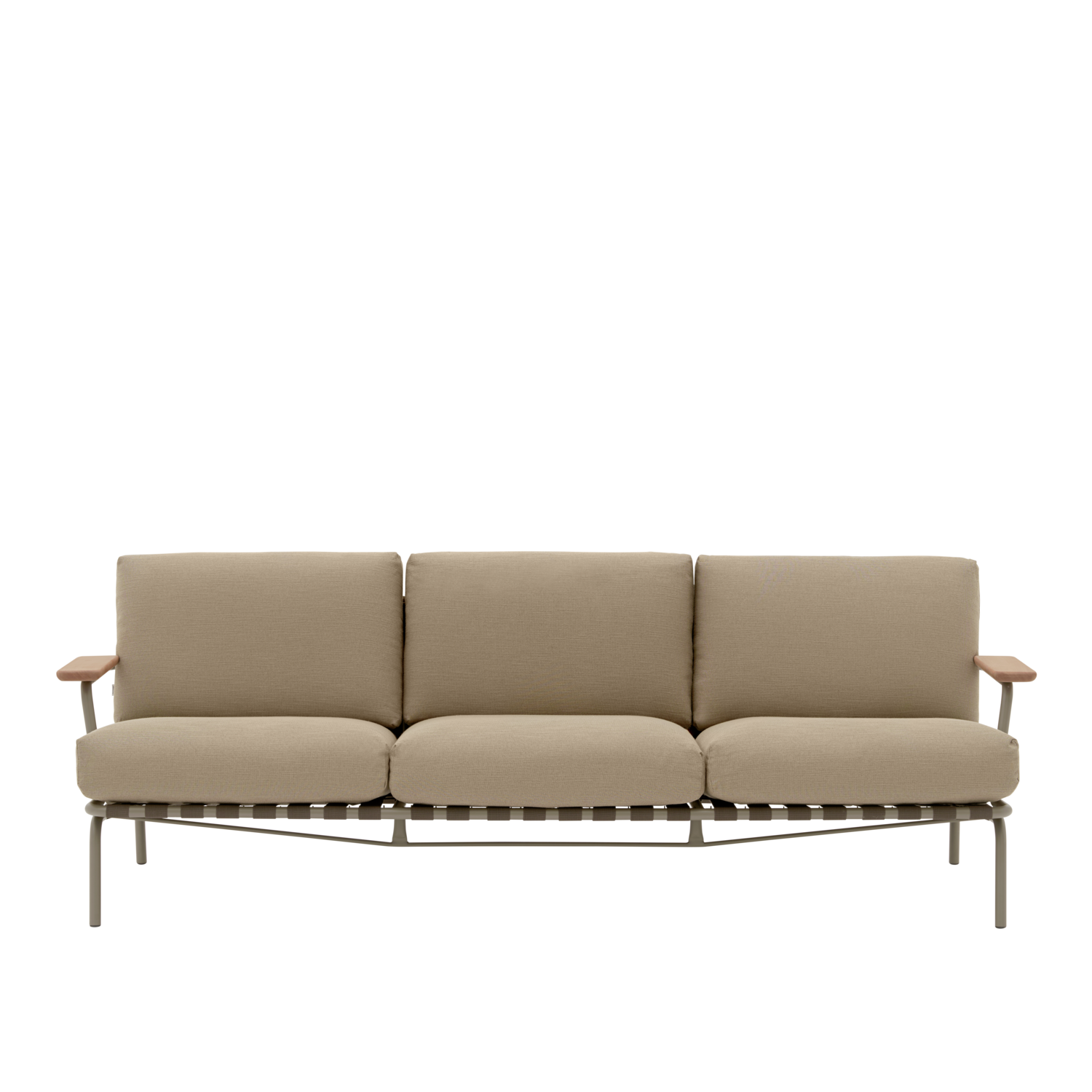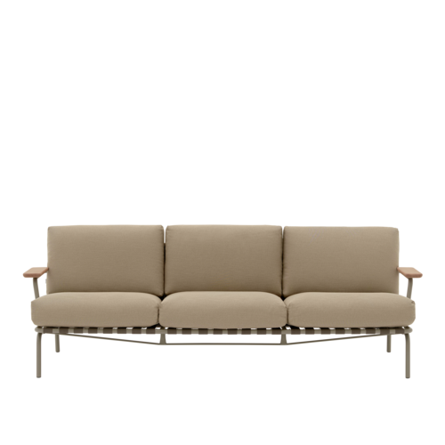 Settle Outdoor Sofa w. Armrest invites you to settle into its comfort, providing an ideal setting for enjoying the outdoors all day. Its airy steel frame, complete with visible belts and intricate details, enhances its visual allure from all angles, while its armrests, made from FSC™-certified (FSC-C028824) sapele mahogany wood, add a warm, tactile feel. Settle’s steel frame is galvanized, primed and powder-coated, ensuring corrosion resistance for long-lasting use. The plush cushions, made with quick-dry foam and durable outdoor textiles, offer fast-drying resilience in rain showers and year-round durability when used with an outdoor cover.